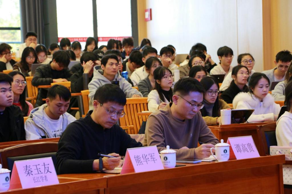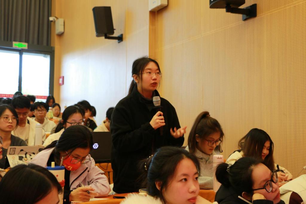 互动问答环节由谭高贵博士主持,现场师生积极提问,如“乡村小规模学校如何留住优秀教师”“人口学龄变动下如何构建弹性教学机制”等。秦教授逐一回应,认为乡村师资短缺可通过提高岗位吸引力、完善政策补助、改善交通条件缓解;面对人口变动,学校要强化教师教学能力准备,理性接受人口减少常态,依托生育友好政策稳定人口规模。