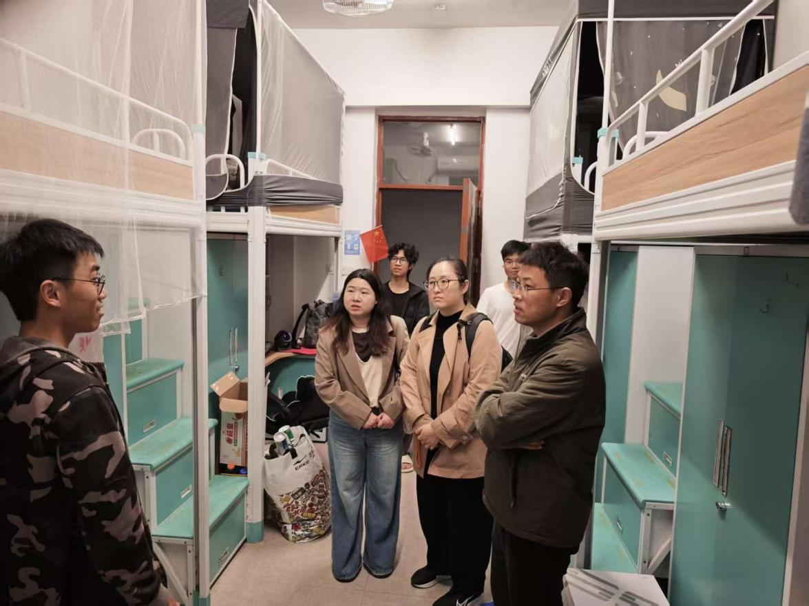 走访过程中,宿舍楼里暖意融融。学院领导、老师与同学们亲切交流,详细询问大家的假期生活、返校适应情况及新学期规划。老师们仔细查看宿舍设施和生活环境,耐心倾听同学们在日常学习、生活中遇到的实际困难,并现场协调解决。针对同学们普遍关心的考研、考编等学业发展问题,老师们结合当前政策和往届经验,提供细致指导和中肯建议,勉励大家明确目标、合理规划,以积极心态和饱满状态开启新学期。