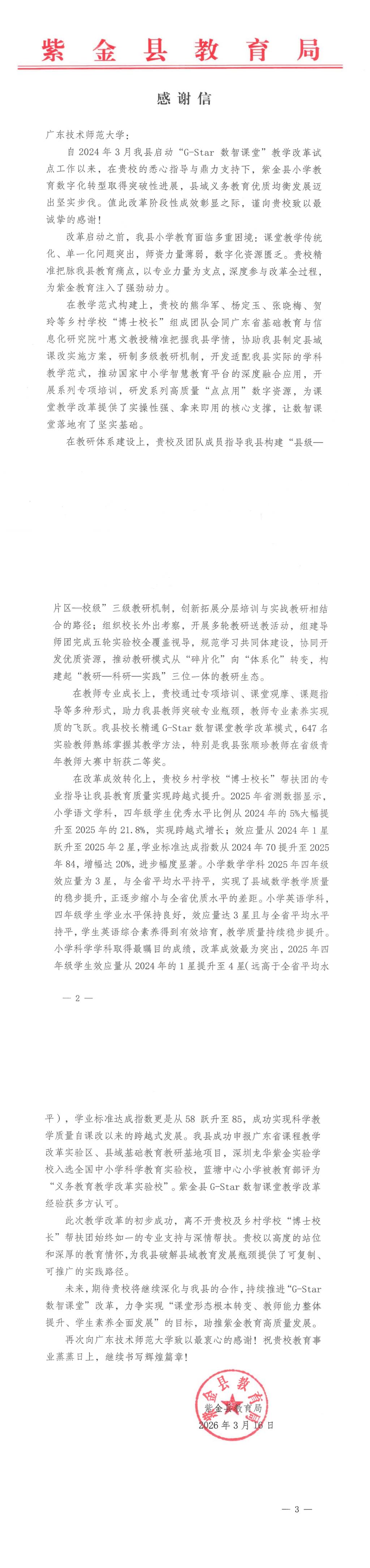 近日,河源市紫金县教育局向我校发来感谢信,对我校纵向帮扶专班在紫金县“G-Star数智课堂”教学改革试点工作中给予的悉心指导与鼎力支持表达了感谢。“G-Star数智课堂”教学改革是一项借助数字化赋能、教研体系优化、教师能力提升、共同体文化建设等手段,破解县域基础教育发展瓶颈,促进基础教育优质均衡发展的重要实践探索。自2024年3月紫金县启动“G-Star数智课堂”教学改革试点以来,紫金县小学教育数字化转型取得了突破性进展,县域义务教育优质均衡发展迈出了坚实步伐。