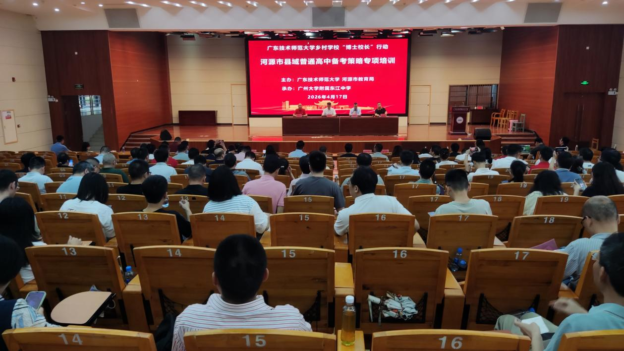 为深入落实广东省师范院校纵向帮扶与县域普通高中振兴工作部署,破解县域高中备考难题,2026年4月17日,广东技术师范大学与河源市教育局在东源县东江中学联合举办河源市县域普通高中备考策略专项培训。河源市各县(区)普通高中校长、教学副校长、高三骨干教师及我校派驻河源“博士校长”、产业教师等150余人共同参与。