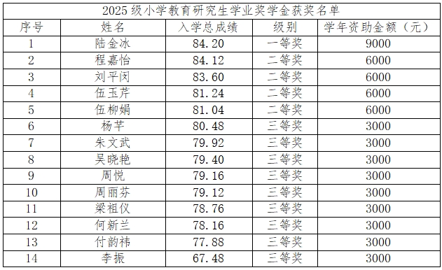 依据广东技术师范大学研究生院《关于开展2025年全日制研究生学业奖学金评审工作的通知》的相关要求,按照“公开、公平、公正”的原则,经学生本人申请、导师同意及基础教育学院研究生工作小组评审,学院拟确定黄若榆、陆金冰等24名同学为2025年全日制研究生学业奖学金获奖学生,现公示如下: