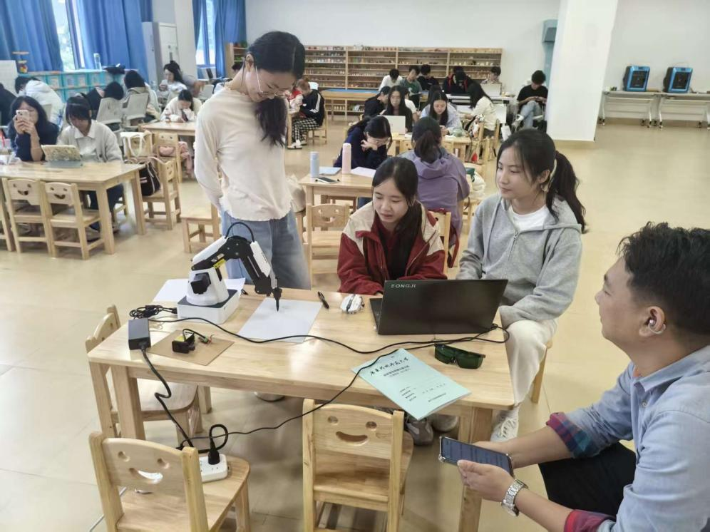 理论讲解结束后,进入了激动人心的实践环节。同学们分组来到机械臂前,在企业讲师的指导下,亲身体验操作机械臂进行写字和激光画画。大家纷纷发挥自己的创意,用机械臂写出了自己的名字,画出了心中想要的美好图案。在操作过程中,同学们遇到了各种问题,但在讲师和同学们的帮助下,都一一克服了困难。通过实践,同学们不仅学会了如何操作机械臂,还深刻理解了人工智能在实际应用中的原理和方法。