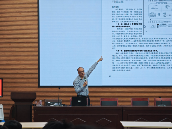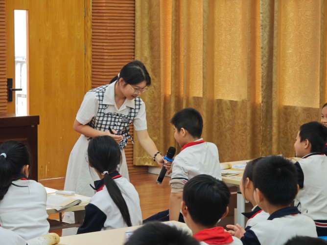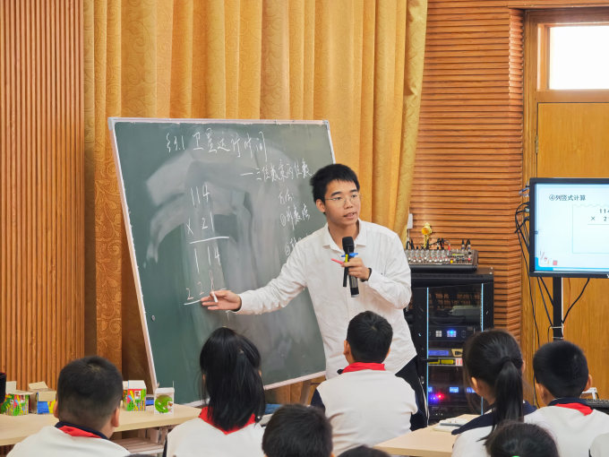 活动由黄巧娣老师主持,来自广东技术师范大学基础教育学院23级小学教育专业的两位同学分别进行了课例展示。廖婷婷同学执教语文课《盘古开天地》,以任务驱动引导学生自主学习,通过图文结合、小组合作等方式,帮助学生梳理神话故事的起因、经过与结果,感受盘古开天辟地的伟大精神;黄昊翔同学执教数学课《卫星运行时间》,围绕“三位数乘两位数”展开教学,通过生活情境引入、算法多样化探索与竖式聚焦,培养学生的运算能力与推理意识。