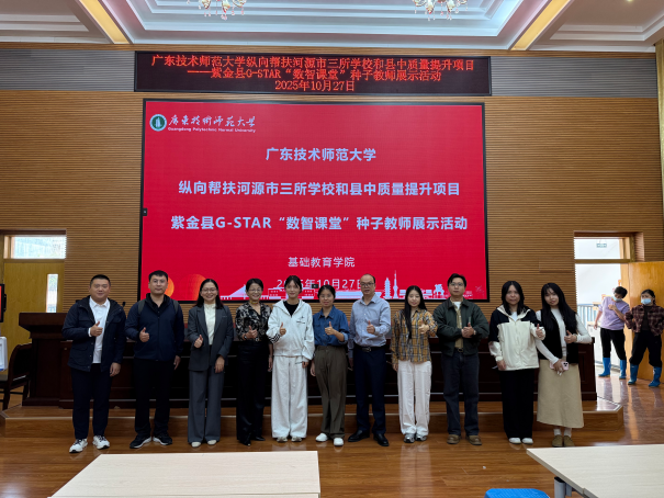 2025年10月27日,“广东技术师范大学纵向帮扶河源市三所学校和县中质量提升项目——紫金县G-STAR“数智课堂”种子教师展示活动在紫金中山实验学校顺利举行。本次活动由基础教育学院承办,旨在通过课例展示与专家指导,推动数字化教学在小学课堂中的深度融合,提升基础教育学院师范生的教学设计与课堂实施能力。