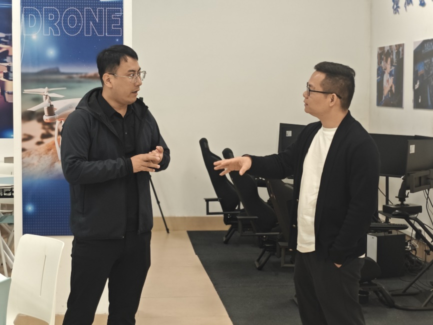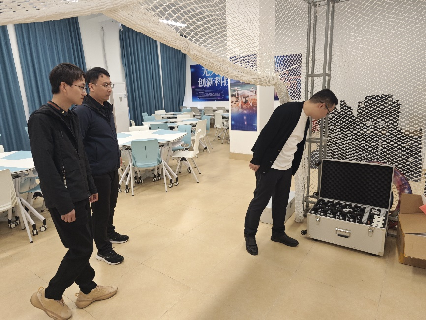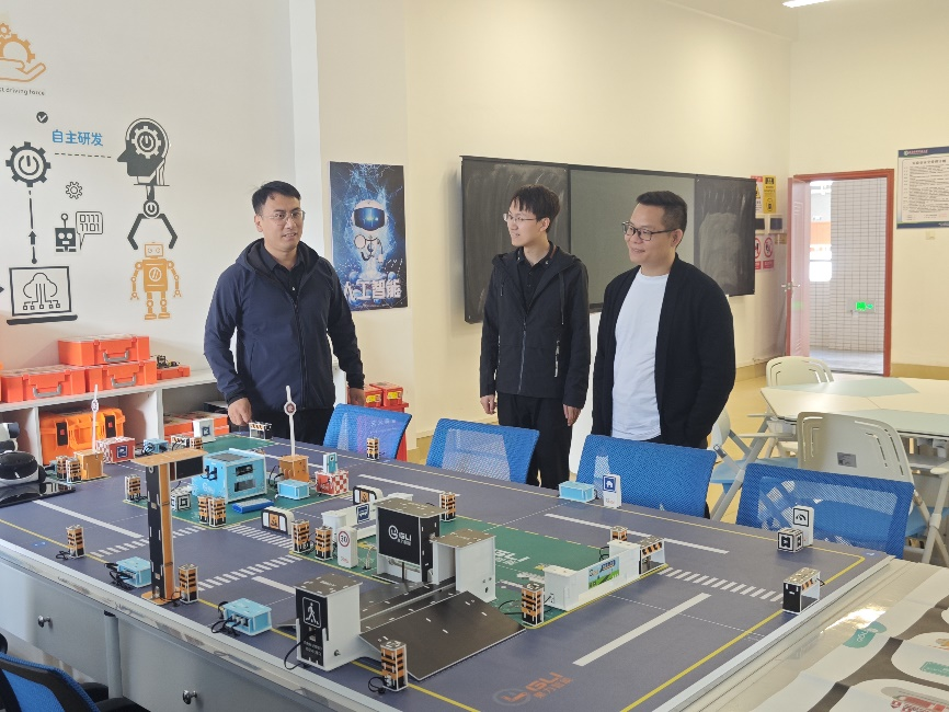 在基础教育学院范高鹏、李奇等教师的陪同下,企业代表实地参观了人工智能创客实训室、虚拟仿真实训室、无人机及模拟飞行实训室等特色教学空间,全面了解我校在智慧教育环境建设与数字化教学资源方面的积累与优势。参访过程中,企业方系统介绍了人工智能机器人的发展历程,并聚焦《十四五规划建议》中重点培育的具身机器人产业,深入解读其技术现状与未来趋势。